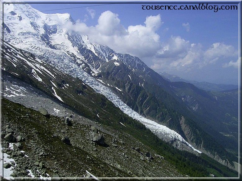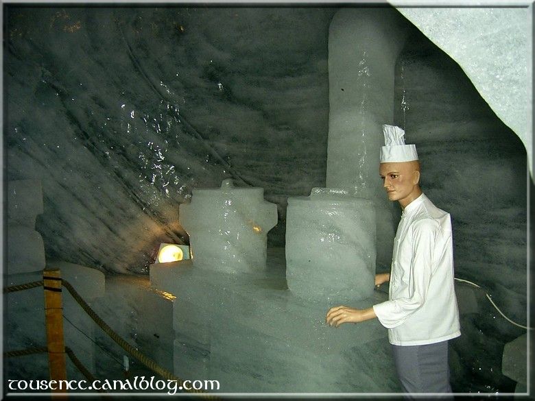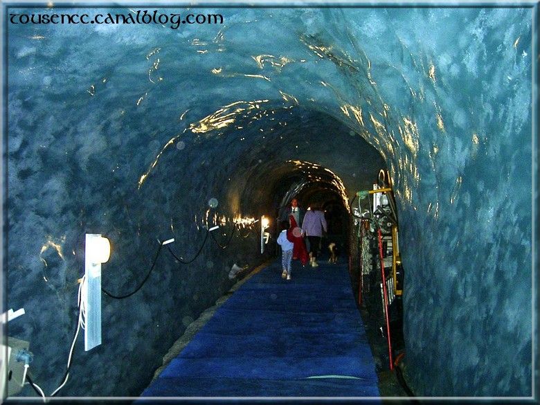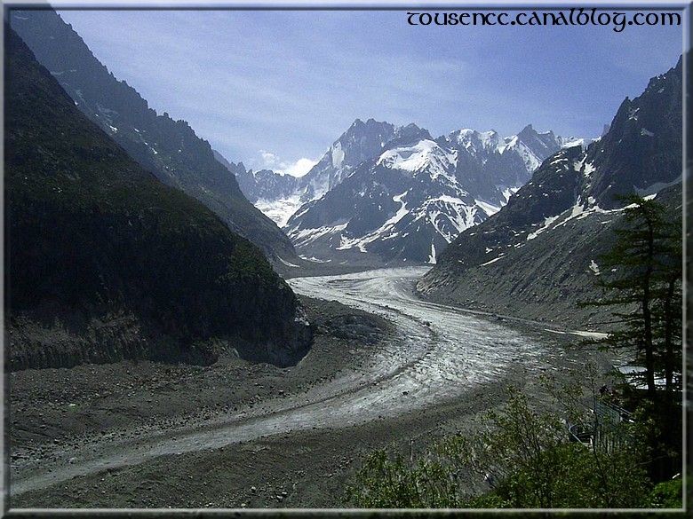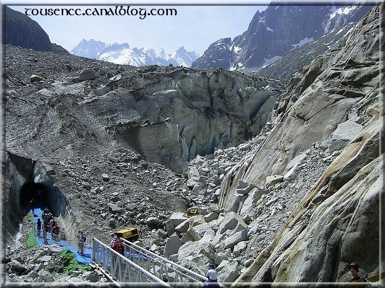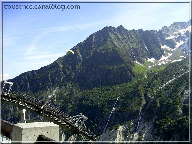 Aujourd’hui, c’est la mer de glace! La montée bien « pentue » se fait sans encombre dans un antique petit train. Des parapentistes profitent du site pour pratiquer leur sport et on admire le paysage.