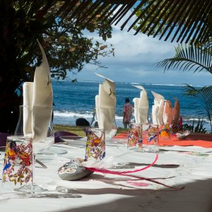 Nous avions choisi de prendre notre repas sur le motu (vous pouvez aussi amener votre pique-nique). On nous amène donc notre plateau repas qui va se révéler succulent. Huumm les saveurs de ces produits locaux : poisson cru au lait de coco, poisson cuisiné, riz parfumé, ananas, fruit de la passion…Nous allons faire durant notre séjour une consommation passionnée de tous ces produits. Avec un petit bémol pour les fruits, car c’est l’hiver ici et ce n’est pas la saison de beaucoup de fruits mais nous réussirons à en trouver quand même auprès des vendeurs ambulants le long de la route.