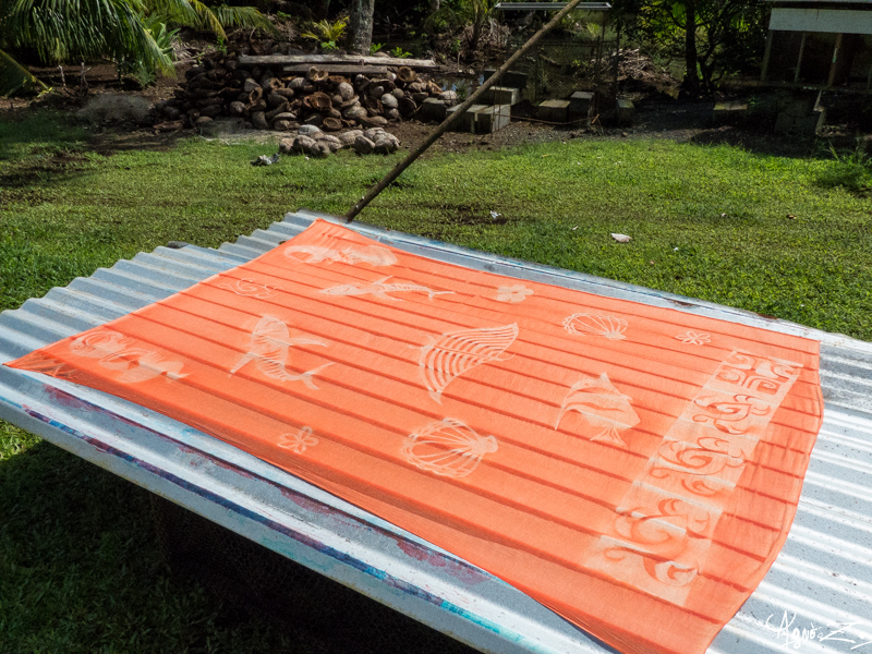 10e jour : Ce matin, Tepoe nous propose une petite balade pour nous amener jusque chez elle où elle nous invite à fabriquer des paréos (pareu en tahitien). Chouette ! on croise un truck, antique bus amené à disparaitre que nous avions emprunté lors de notre premier séjour. Aujourd’hui il sert essentiellement au transport scolaire.