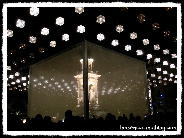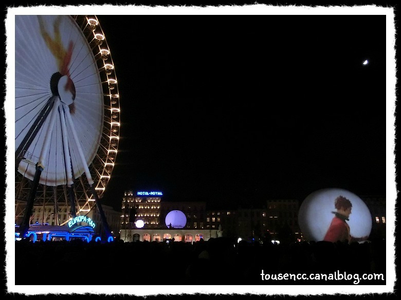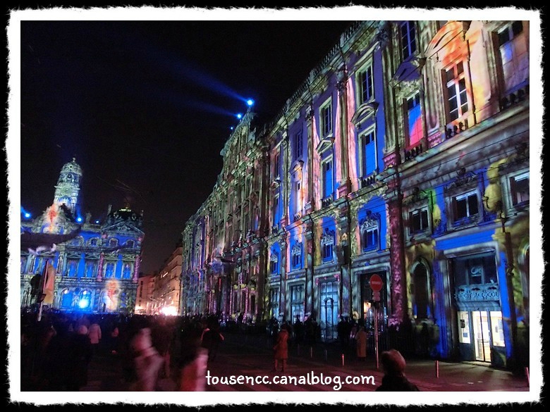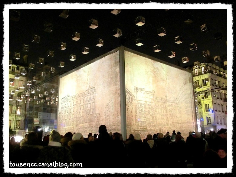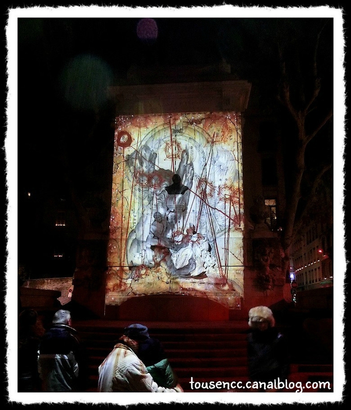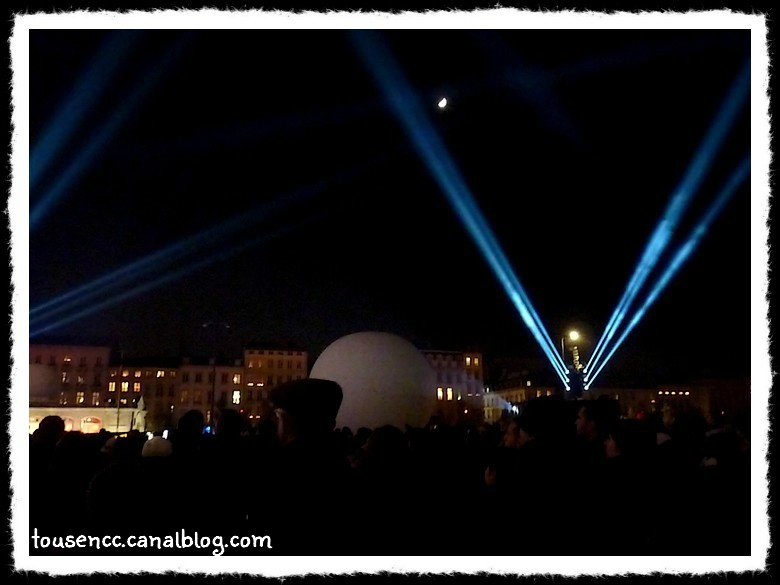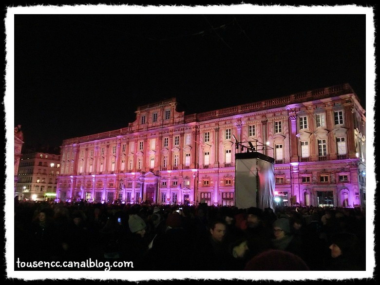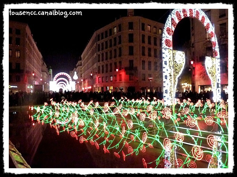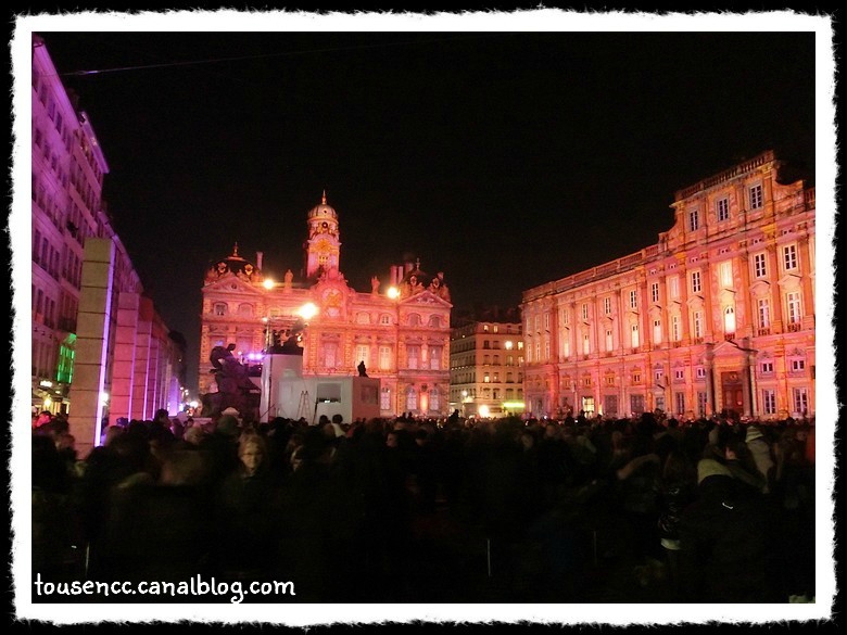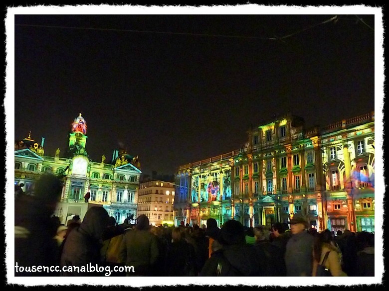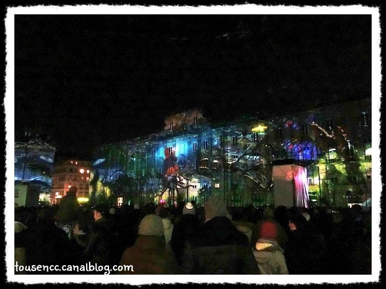 La foule aujourd’hui me rebute (encore 4 millions de visiteurs cette année !) et après une expérience traumatisante lors d’une énième fête, prisonnière de la foule, nous ne profitions de la fête que par petit écran interposé. Et puis cette année, nous nous sommes dit que ce serait bien de tenter à nouveau l’expérience. Et ce fut chose faite ce dimanche soir. Nous nous sommes limités à la Presqu’île mais il faut savoir que le nombre de petites ou grandes manifestations est impressionnant et répandu un peu dans tout Lyon.