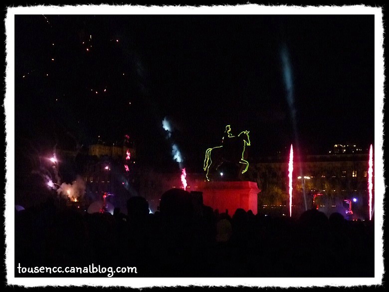 La place Bellecour nous fait son show, entre pyrotechnie et lasers :