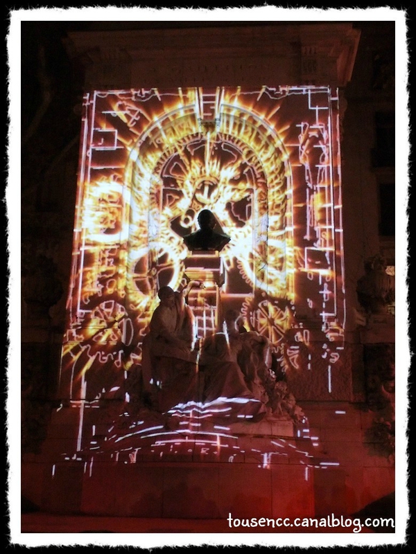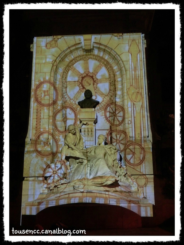la fresque des lyonnais parée de ses lumières, grâce à une vidéo projetée sur la façade :