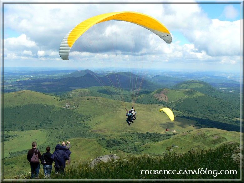 car nous avons décidé d’y monter. Alors il faut savoir qu’en juillet/aout, on ne peut monter jusqu’en haut en voiture (ou camping-car) car au vu de la forte affluence, le parking en haut ne suffirait pas et ils veulent préserver le plus possible la nature du site. Nous nous arrêtons donc au parking en bas. Il existe plusieurs possibilités : soit monter à pied (que je regrette d’avoir oublié mes chaussures!!), aller-retour avec la navette, ou juste le retour ou l’aller avec le reste à pied. Nous choisissons la navette : il nous en coutera 9,40 € pour deux adultes et un enfant. Nous comprenons la nécessité de ce système mais c’est quand même un peu cher. Arrivés au sommet, quel panorama sur toute la chaine des puys! Le temps n’est toujours pas au grand beau mais quand le soleil fait son apparition, c’est grandiose!