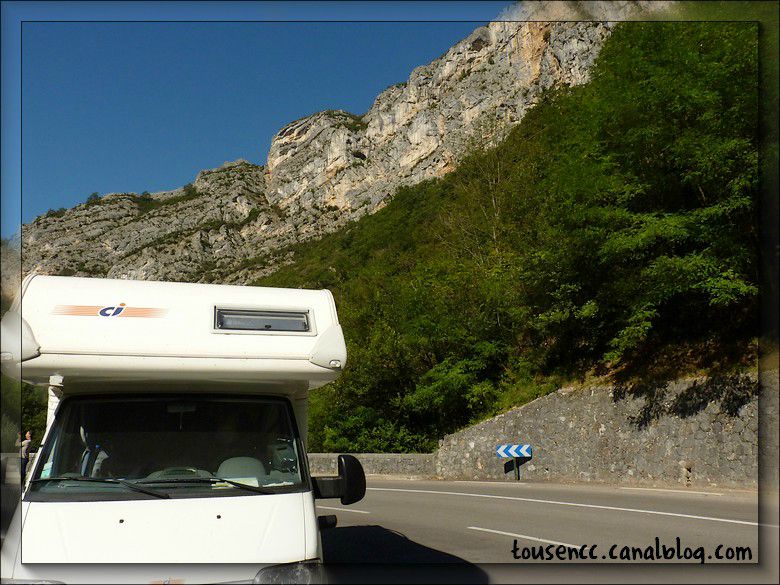 Après une nuit calme à souhait, nous nous dirigeons sur les grottes de Choranche. La route qui nous y conduit passe par Pont en Royans que nous connaissons déja puis traverse les gorges de la Bourne avant de déboucher sur les grottes.