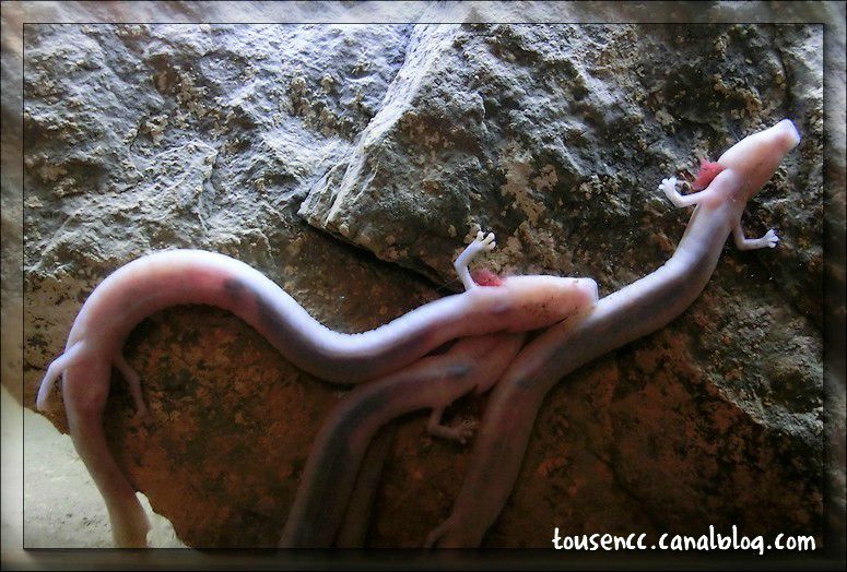 Nous découvrons les protées : petits animaux cavernicoles, cousins de la salamandre, sans pigmentation du fait de leur vie sans lumière.