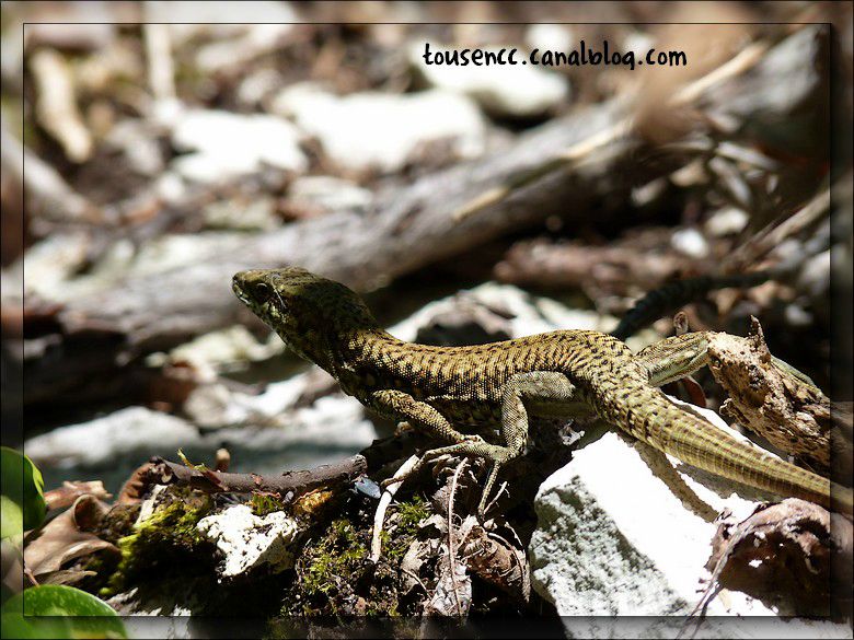 Il fait très chaud mais la balade est agréable. Nous aurons une petite frayeur lorsque nous entendrons un bloc de pierre se détacher de la paroi et tomber dans les fourrés qui se trouvent au pied de la falaise. Je surprendrai ce petit lézard savourant sa pause au soleil.