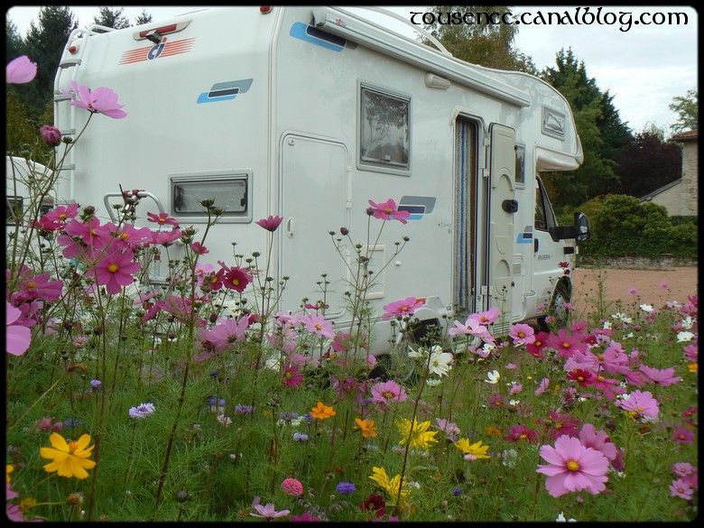 Le lendemain, j’ouvre les volets sur le champ juste en face de nous et un superbe cheval blanc. Quel bonheur de se réveiller avec ce genre de vue ! Malheureusement le temps s’est bien couvert et les nuages retiennent prisonnier le magnifique soleil que nous avions hier. Tant pis ! Nous filons quand même sur St Haon le Chatel et surprise ! le village possède aussi une aire de services. A deux pas du village, en retrait, et au milieu d’un champ de fleurs !! Si, si, je ne débloque pas, photos comme preuve à l’appui :